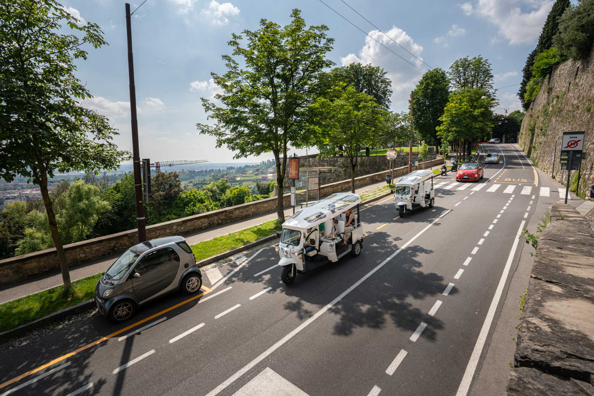 Discover the beauty of the Upper Town of Bergamo on a Tuk Tuk, a unique and fun way to explore the city. This tour will take you through the historic Venetian Walls, a UNESCO World Heritage Site, while admiring the ancient entrance gates and impressive panoramic viewpoints. We will reach the San Vigilio hill, where you will enjoy a breathtaking view of the entire city.